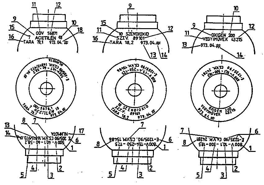 3.1.4. Az 1., 2. és 3. számjelű [lásd R. 5. § (5) bekezdésében felsorolt] irányelveknek megfelelő típusengedéllyel rendelkező, és az irányelvek szerinti vizsgálatokon megfelelt palackokra a IV., V. és VI. fejezetek 6.2. pontjában megadott – és a fejezetek mellékletében látható – megjelöléseket helyezi el a gyártó. Ezekre a palackokra nem kell ismételten beütni az I. fejezet melléklete szerinti következő megjelöléseket: – a gyártó nevét vagy jelét,