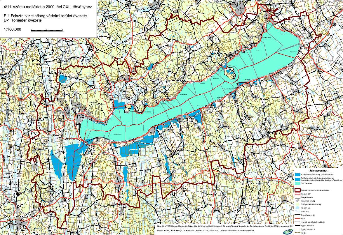 k) a 4/11. számú melléklet a felszíni vízminőség-védelmi terület övezetét (F-1), valamint a tómeder övezetét (D-1),