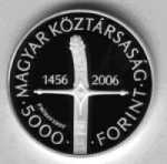 (2) Az emlékérme előlapján a középmezőben egy szablya díszes markolata látható. A szablya markolatától balra az „1456”, jobbra pedig a „2006” évszámok olvashatók. Az emlékérme szélén köriratban fent a „MAGYAR KÖZTÁRSASÁG” felirat, lent, a szablya pengéjétől balra az „5000” értékjelzés, jobbra pedig a „FORINT” felirat olvasható. A szablya pengéjén négyzet formájú keretben, két sorban az „550” és az „ÉV” felirat olvasható, a keret alatt pedig a „BP.” verdejel található. Az emlékérme előlapjának képét e rendelet 1. melléklete tartalmazza.