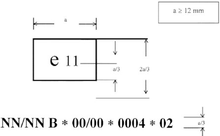 az „e” nyomtatott kisbetűt körbevevő négyszög, amelyet annak a tagállamnak a megkülönböztető száma követ, amelyik megadta az EK-alkatrész-típusjóváhagyást: