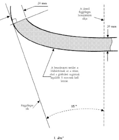 „4.5.2. Ha az első vagy hátsó lökhárító vonala felülnézetben egybeesik a jármű kontúrvonalával és a lökhárító szilárd felületre van rögzítve, akkor a kontúrvonal és az azt követő és attól mindenütt 20 mm távolságra lévő pontok által képzett, a kontúron belül lévő vonal között e felület görbületi sugarának legalább 5 mm-nek kell lennie. A lökhárítók többi részére legalább 2,5 mm görbületi sugár érvényes.