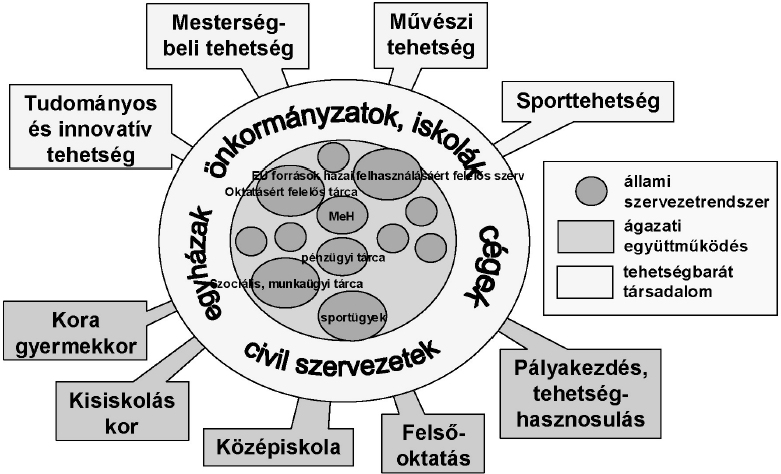 Az alábbi ábra összefoglalóan ábrázolja a Nemzeti Tehetség Program megvalósításában résztvevő szervezet-csoportokat és vázlatosan feltünteti a tehetségsegítés tematikus irányait és korcsoportjait.22