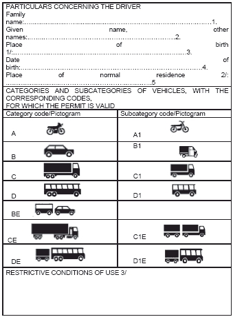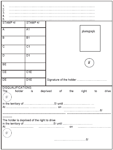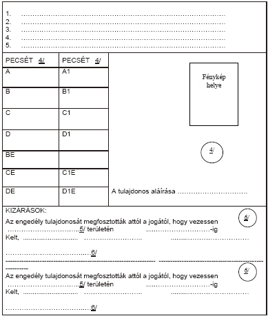 4/ Az engedélyt kiállító hatóság vagy egyesület pecsétje vagy bélyegzője. Ez a pecsét vagy bélyegző csak abban az esetben helyezendő el a kategóriák vagy alkategóriák rovataiban, ha a tulajdonos a szóban forgó járművek vezetésére fel van jogosítva.