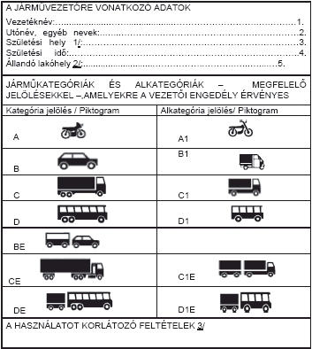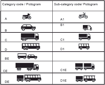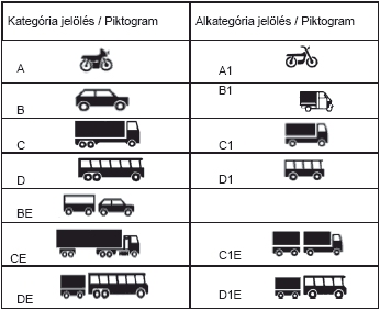 11. A járműkategóriákat (alkategóriákat), melyekre a vezetői engedély érvényes, a következő táblázatban szereplő piktogramokkal kell jelölni.