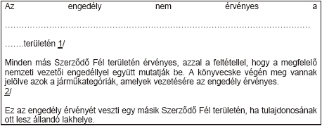 vezetésre érvényesként a saját területükön olyan jármű vezetésére, amely beletartozik az engedély által megjelölt kategóriákba, feltéve, hogy az említett vezetői engedély érvényes, és azt egy másik Szerződő Fél vagy annak szerve, vagy a másik Szerződő Fél, illetve annak alárendelt szerve által e célból feljogosított szervezet állította ki;