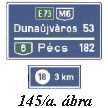 „y/1. „Útvonal megerősítő tábla” (145/a. ábra); a tábla autópályán és autóúton az út számát, a táblán megjelölt települések távolságát (km mértékegységben) jelzi, továbbá az útcsatlakozások távolságát is jelezheti;