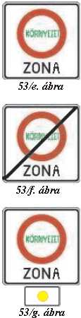 „z/3. „Környezetvédelmi övezet (zóna)” (53/e. ábra); a jelzőtábla azt jelzi, hogy a „Környezetvédelmi övezet (zóna) vége” (53/f. ábra) jelzőtábláig az úton (övezetben) a gépkocsik nem közlekedhetnek. A kiegészítő jelzőtábla jelzi (53/g. ábra) azon környezetvédelmi igazolólaphoz tartozó – a hatósági jelzésen (rendszámtáblán) elhelyezett – matrica színét, amellyel rendelkező gépkocsira a behajtás tilalma vonatkozik. A behajtási tilalom alól az út kezelője felmentést adhat. A kiegészítő jelzőtáblán „Kivéve engedéllyel” felirat is elhelyezhető.