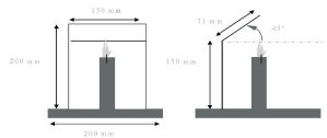Helyezzen el egy 20–40 mm átmérőjű, 100 mm magas paraffingyertyát egy 200 × 200 mm felületű fémtalapzatra. Amikor a gyertya magassága 80 mm alá csökken, ki kell cserélni. A gyertya lángját a permet hatásától egy 150 mm széles, 200 mm magas terelőlappal védjük. A terelőlap folytatásaként egy, a vízszintessel 45°-ot bezáró lapot is kell szerelni, a terelőlap aljától 150 mm magasságban (2.2. ábra); |