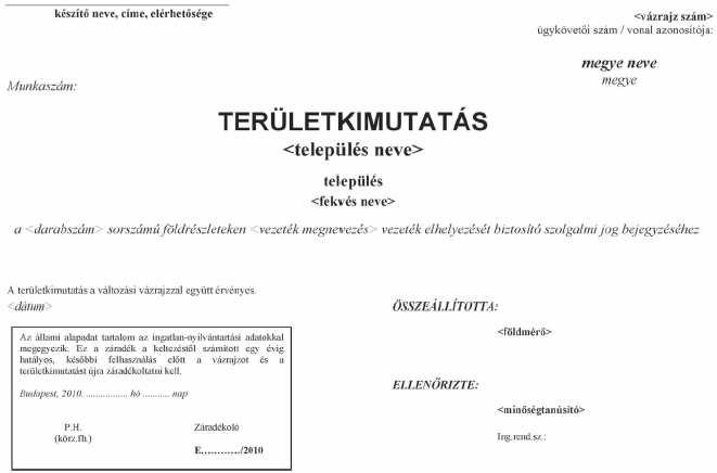 13. § (1) A változott területi adatokat a készítőnek a munkarészekhez csatolt területszámítási jegyzőkönyvből kell átvennie. A területkimutatás külön munkarészként is elkészíthető, de ebben az esetben a változási vázrajzot „A változási vázrajz a területkimutatással együtt hatályos.” záradékkal kell ellátni.