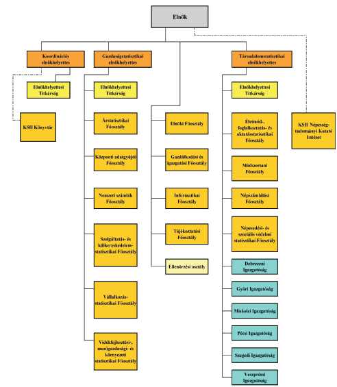 „(2) A KSH egyszemélyi felelős vezetője az elnök, akinek a munkáját egy koordinációs, egy gazdaságstatisztikai, valamint egy társadalomstatisztikai elnökhelyettes segíti.”