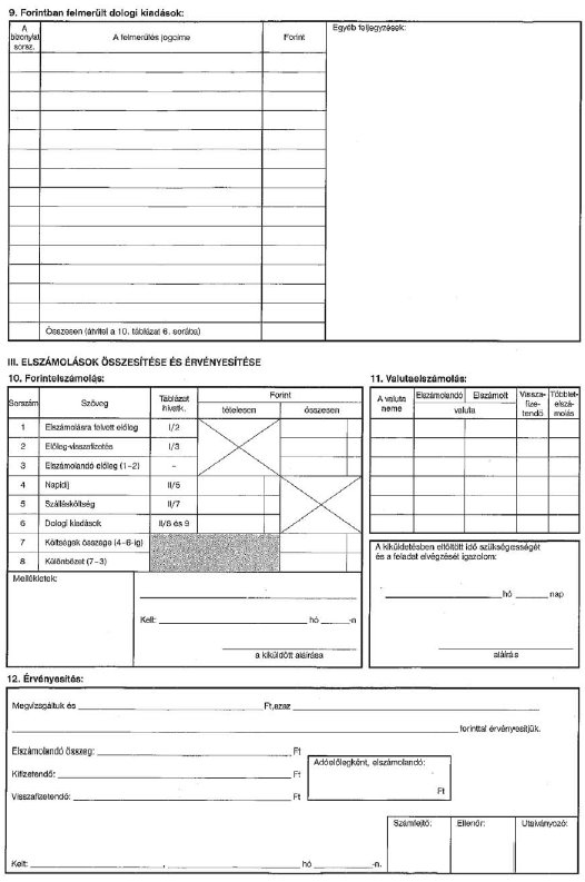 10. § (1) A kiküldöttnek a felvett előleggel a külföldi kiküldetésből történő hazatéréstől számított három munkanapon belül a Gazdasági Főigazgatóságon – személyesen vagy meghatalmazott útján – a 3. melléklet szerinti nyomtatványon, a számlák vagy számviteli elszámolásra alkalmas bizonylatok egyidejű csatolásával el kell számolnia. Minden egyes idegen nyelvű számla vagy bizonylat mellé ki kell állítani a 4. melléklet szerinti fordítási bizonylatot.