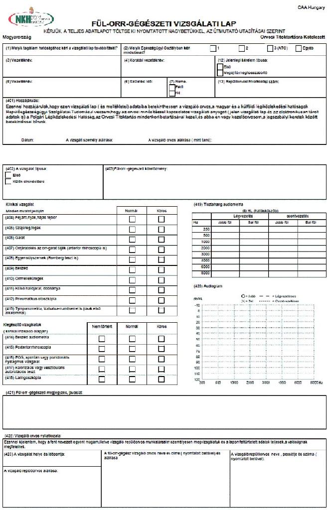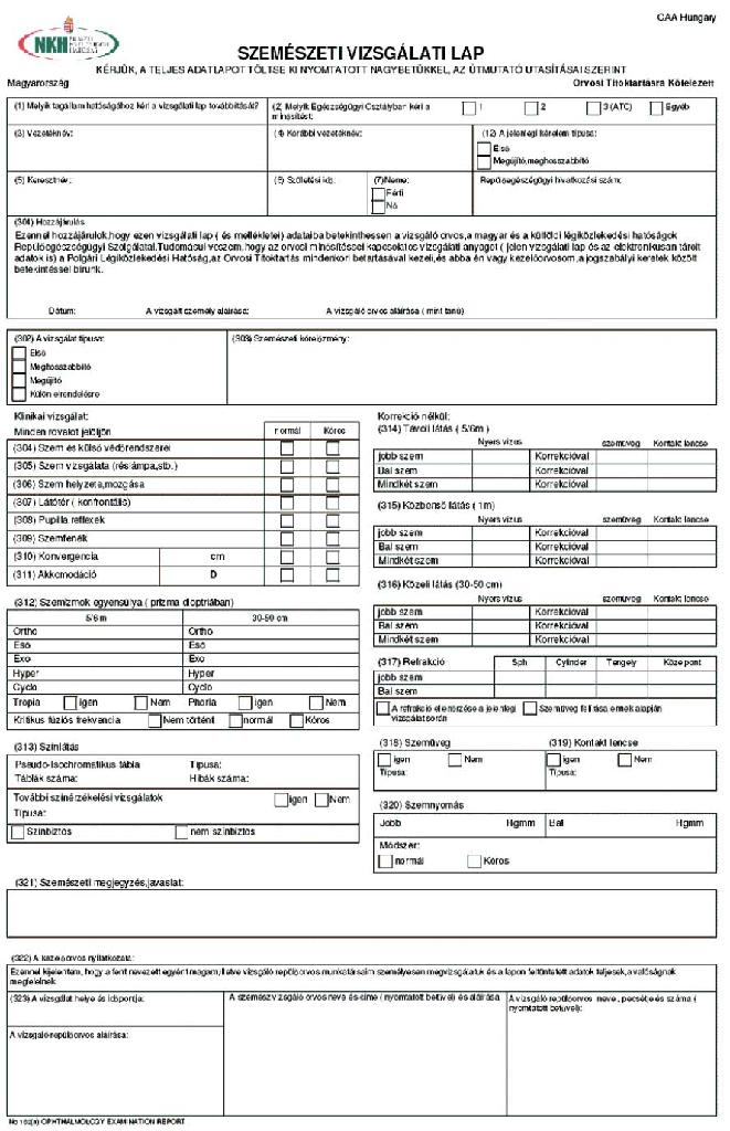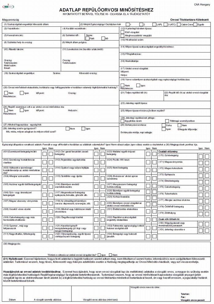 5. § (1) A vizsgált személynek személyesen kell kitöltenie a légiközlekedési hatóság által rendszeresített, az 1. mellékletben meghatározott tartalmi és formai követelményeknek megfelelő repülőorvosi adatlap megfelelő pontjait, majd alá kell írnia.