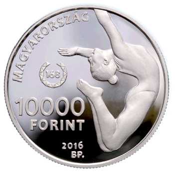(2) Az emlékérme előlapján, a jobb oldali érmemezőben egy homorító női tornász alak, balra a Magyar Olimpiai Bizottság – modernkori nyári olimpiák során szerzett magyar aranyérmek számára utaló – „168” logójának ábrázolása látható. Az emlékérme bal oldali szélén, negyed köriratban a „MAGYARORSZÁG” felirat, a „168” logó ábrázolása alatti vízszintes sorokban a „10 000” értékjelzés, a „FORINT” felirat, a „2016” verési évszám és a „BP.” verdejel olvasható. A verdejelben legalább tízszeres nagyítás esetén látható, a verdejel adott betűjével megegyező betűket ábrázoló mikroírás került elhelyezésre. Az emlékérme előlapjának képét az 1. melléklet tartalmazza.