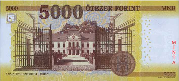 4. § (1) A bankjegy hátoldala többszínű, a nagycenki Széchenyi-kastély kertjét felülnézetből megjelenítő alapnyomattal és vörösesbarna színű képnyomattal készült, amelynek összhatása sárga. Az alapnyomat sárga színhatású. A vízjelmező mellett balra 1 mm átmérőjű sárga színű körök láthatók. Az alapnyomat bal felső részén a sárga és barna színű illeszkedőjel hátoldali eleme található.