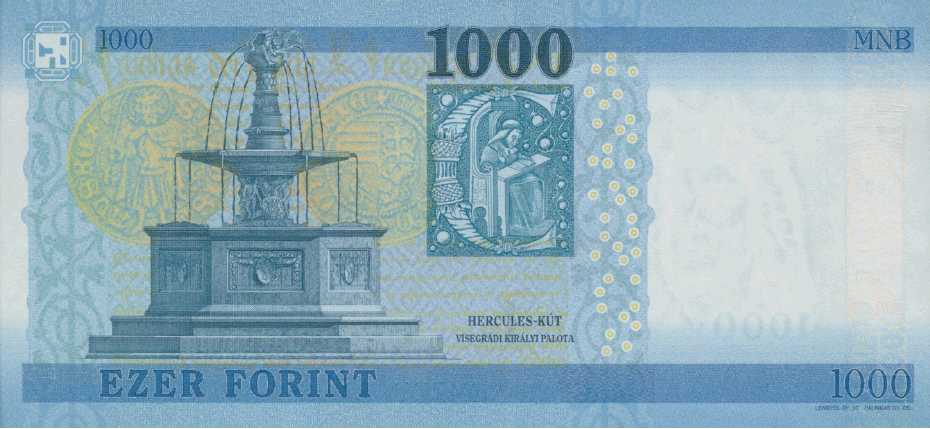 (3) A képnyomat fő motívuma a visegrádi királyi palotában található Hercules-kút alapján készült metszet, háttérben a Mátyás király által kibocsátott aranyforint érme elő- és hátlapjának ábrázolásával. A metszettől jobbra Georgius Trapezuntius: Rhetoricorum libri című corvinájából származó, „C” betűt ábrázoló iniciálé látható. Az alsó mikroírás sávban a rátekintés szögétől függően az „MNB” felirat jelenik meg. A metszettől jobbra, egymás alatti vízszintes sorokban a „HERCULES-KÚT” és a „VISEGRÁDI KIRÁLYI PALOTA” felirat, az iniciálé fölött az „1000” értékjelzés olvasható.