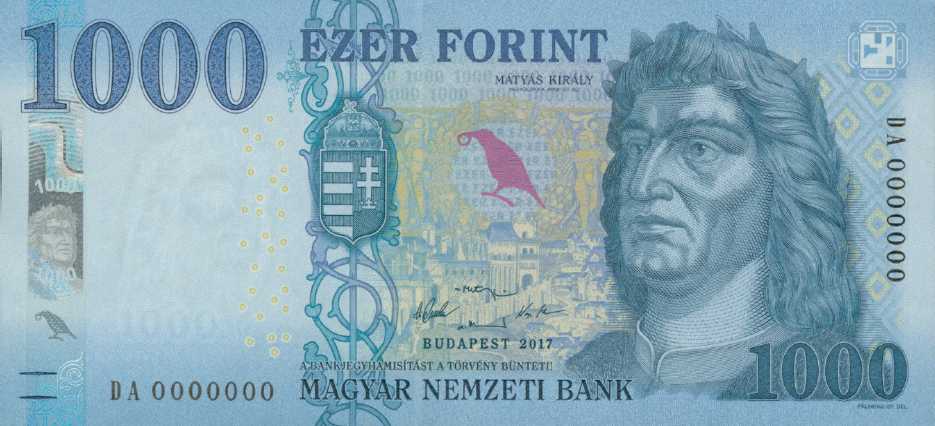 (3) A szövegtükörben az „EZER FORINT” felirat, majd egymás alatti vízszintes sorokban Dr. Matolcsy György, Dr. Gerhardt Ferenc, Nagy Márton és Dr. Windisch László névaláírása, a „BUDAPEST 2017” felirat, a bankjegyhamisításért való büntetőjogi felelősségre vonatkozó, az „A BANKJEGYHAMISÍTÁST A TÖRVÉNY BÜNTETI!” záradék, valamint a „MAGYAR NEMZETI BANK” felirat olvasható. Az évszám és a névaláírások változhatnak.