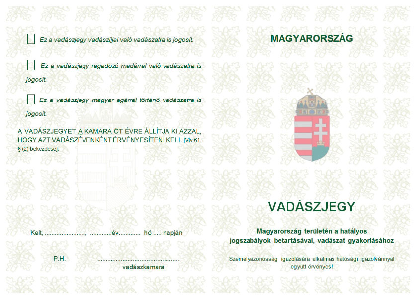 „50. § (1) Az állami vadászjegy kiállításának és minden további vadászati évre történő érvényesítésének díja tízezer forint. (2) A vadászjeggyel rendelkező vadászokról, valamint a hivatásos vadászokról vezetett – évente aktualizált – nyilvántartást a vadászkamara területi szervezete minden év május 31-ig megküldi a területileg illetékes vadászati hatóságnak.”