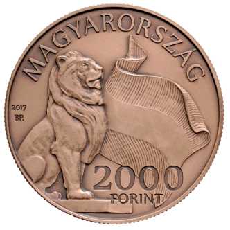 (2) Az emlékérme előlapján, a középmezőben az Országház főbejáratához vezető lépcsősor peremén található egyik bronzoroszlán oldal irányú ábrázolása látható, jobbra Magyarország zászlajával. Az emlékérme szélén, fent, félköriratban a „MAGYARORSZÁG” felirat, a bronzoroszlán ábrázolásától jobbra lent a „2000” értékjelzés és a „FORINT” felirat, bal oldalon a „2017” verési évszám és a „BP.” verdejel olvasható, két-két vízszintes sorban. A verdejelben legalább tízszeres nagyítás esetén látható, a verdejel adott betűjével megegyező betűket ábrázoló mikroírás került elhelyezésre. Az emlékérme előlapjának képét az 1. melléklet tartalmazza.