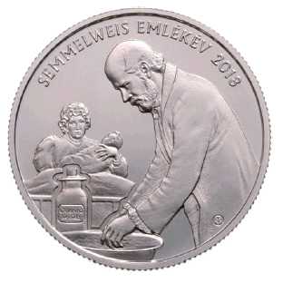 (3) Az emlékérme hátlapján egy kórházi jelenet ábrázolása látható, előtérben az orvosi köpenyt viselő Semmelweis Ignáccal, amint klórmésszel kezet mos egy mosdótálban, háttérben egy pólyás csecsemőt tartó, kórházi ágyban fekvő édesanyával. Az emlékérme szélén, fent, félköriratban a „SEMMELWEIS EMLÉKÉV 2018” felirat olvasható, lent, Semmelweis Ignác köpenyének ábrázolásába illesztve Kereszthury Gábor tervezőművész mesterjegye látható. Az emlékérme hátlapjának képét a 2. melléklet tartalmazza.