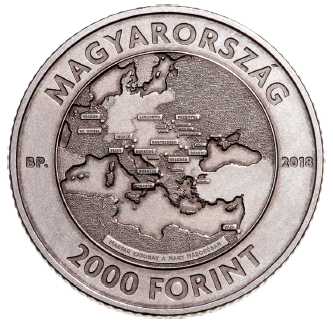 (2) Az emlékérme előlapján, körvonallal határolt középmezőben – az Első világháborúban szembenálló hatalmakat, valamint a semleges országokat három különböző felületi kiképzéssel megjelenítve – Európa-központú világtérkép-részlet ábrázolása látható, melyen az Első világháború magyar katonák részvételével zajlott legjelentősebb ütközeteit egy-egy csillag és a települések bekeretezett neve jelöli, két különböző betűméretben. A belső körvonalat követve, lent, középen a „MAGYAR KATONÁK A NAGY HÁBORÚBAN” bekeretezett felirat olvasható. Az emlékérme szélén, köriratban, fent a „MAGYARORSZÁG” felirat, lent a „2000” értékjelzés és a „FORINT” felirat, bal oldalon a „BP.” verdejel, jobb oldalon a „2018” verési évszám olvasható. Az emlékérme előlapjának képét az 1. melléklet tartalmazza.