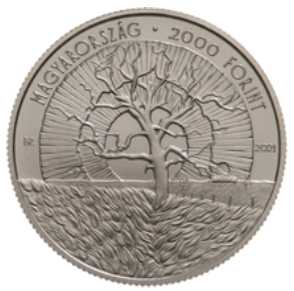 (2) Az emlékérme előlapján szélfútta, füves tájon álló kopár fa ábrázolása látható, háttérben a felkelő nappal, amely egy tágra nyílt szem kinagyított szivárványhártyájára és pupillájára emlékeztet. Az előlap szélén, fent, köriratban a „MAGYARORSZÁG” felirat, mellette – egy díszítő ponttal elválasztva – a „2000” értékjelzés és a „FORINT” felirat, bal oldalon a „BP.” verdejel, jobb oldalon a „2021” verési évszám olvasható. Az emlékérme előlapjának képét az 1. melléklet tartalmazza.