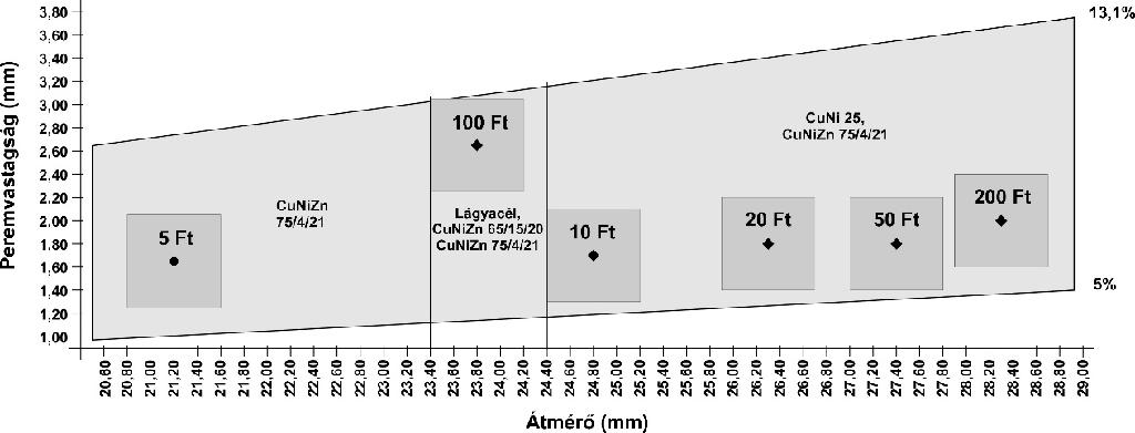 3. A forgalmi érme, valamint a forgalmiérme-emlékváltozat utánzatának átmérő- és peremvastagság tartományára vonatkozó korlátozások meghatározása