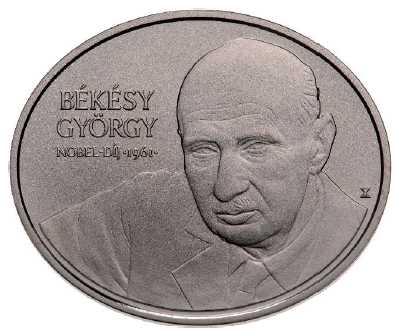 (2) Az emlékérme előlapján a környezetből érkező hanghullámok belső fül csigájában való terjedésének ábrázolása látható. A fül csigájának ábrázolásába illesztve – apró betűkkel, illetve számokkal – belül a „BÉKÉSY GYÖRGY A BELSŐ FÜL CSIGÁJÁBAN LÉTREJÖVŐ INGERÜLETEK FIZIKAI MECHANIZMUSÁNAK FELFEDEZÉSÉÉRT KAPOTT FIZIOLÓGIAI ÉS ORVOSTUDOMÁNYI NOBEL-DÍJAT 1961-BEN” felirat, kívül hanghullámhossz jelölések – „200 Hz 400 Hz 600 Hz 800 Hz 1000 Hz 1500 Hz 2000 Hz 3000 Hz 4000 Hz 5000 Hz 7000 Hz 20000 Hz” – olvashatók. Az előlap bal oldalán, középen, három egymás alatti sorban a „2000” értékjelzés, a „FORINT” felirat és a „BP.” verdejel, lent – a perem ívét követve – a „MAGYARORSZÁG” felirat és a „2022” verési évszám olvasható. Az előlap jobb oldali szélén, középen Endrődy Zoltán tervezőművész mesterjegye látható. Az emlékérme előlapjának képét az 1. melléklet tartalmazza.