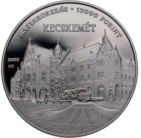 (2) Az emlékérme előlapján a kecskeméti városháza épületének Kossuth tér felőli ábrázolása látható, az épület előtti tér részletével. Az épület ábrázolása fölött, középen a „KECSKEMÉT” felirat olvasható. Az előlap szélén, fent, félköriratban a „MAGYARORSZÁG” felirat, valamint – egy pont motívummal elválasztva – a „15000” értékjelzés és a „FORINT” felirat, bal oldalon, két egymás alatti sorban a „2022” verési évszám és a „BP.” verdejel olvasható. Az előlap jobb oldali szélén – az épület előtti tér ábrázolásába illesztve – Kereszthury Gábor tervezőművész mesterjegye látható. Az emlékérme előlapjának képét az 1. melléklet tartalmazza.
