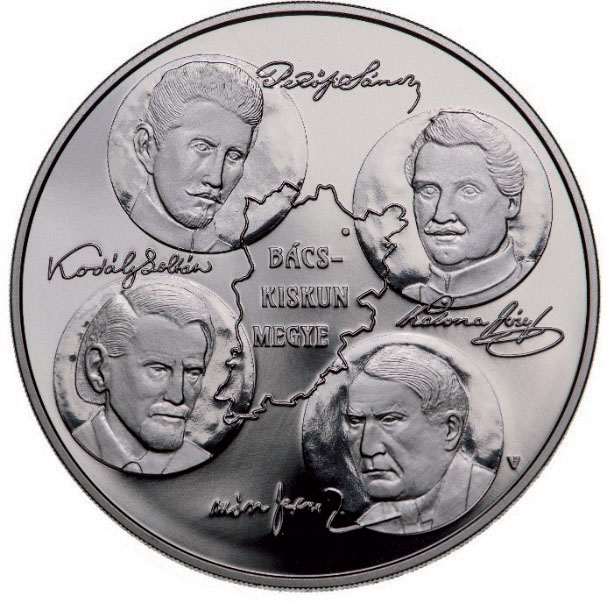(3) Az emlékérme hátlapján Bács-Kiskun megye híres szülötteinek − az óramutató járásával megegyezően haladva, Petőfi Sándor, Katona József, Móra Ferenc és Kodály Zoltán – arcképe látható, egy-egy kör formájú alapon kiemelve, mellette az egyes személyek aláírásával. A hátlap középső részén Bács-Kiskun megye térképszerű ábrázolása látható, a megyeszékhely Kecskemét helyét egy ponttal jelölve. Az ábrázolásba illesztve, három egymás alatti sorban a „BÁCS-” a „KISKUN” és a „MEGYE” felirat olvasható. A hátlap jobb oldali szélén, lent Vékony Fanni tervezőművész mesterjegye látható. Az emlékérme hátlapjának képét a 2. melléklet tartalmazza.