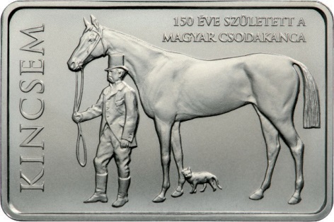 (3) Az emlékérme hátlapján Kincsem négyéveskori – Emil Adam festőművész 1878-as festménye alapján készült – teljes alakos ábrázolása látható, gazdájával, Blaskovich Ernővel és Kincsemet a versenyekre elkísérő macskával. A hátlap szélén, bal oldalon, függőlegesen a „KINCSEM” felirat, jobb oldalon, fent, két vízszintes sorban a „150 ÉVE SZÜLETETT A MAGYAR CSODAKANCA” felirat olvasható. Az emlékérme hátlapjának képét a 2. melléklet tartalmazza.
